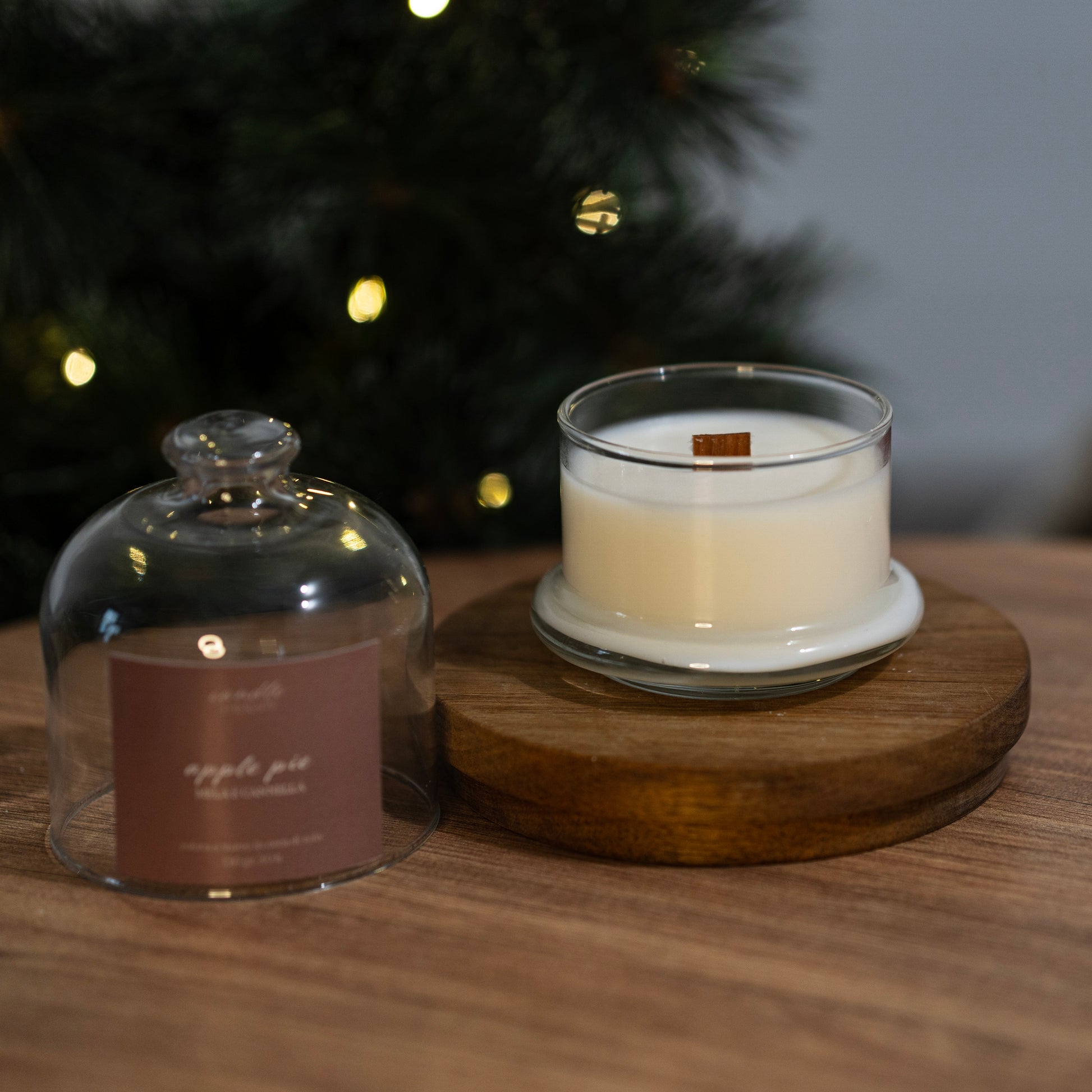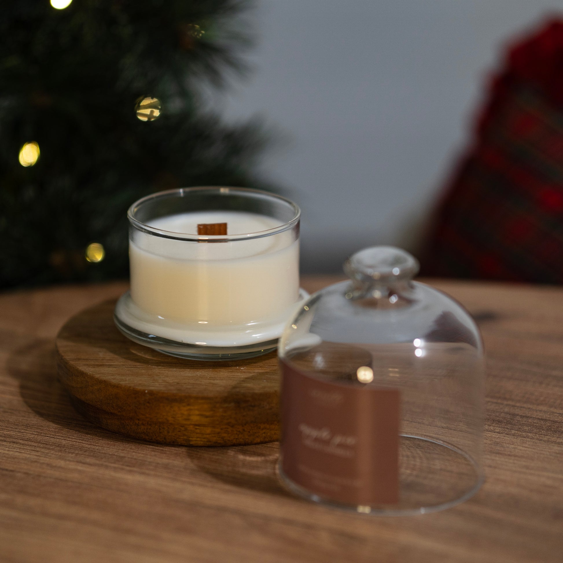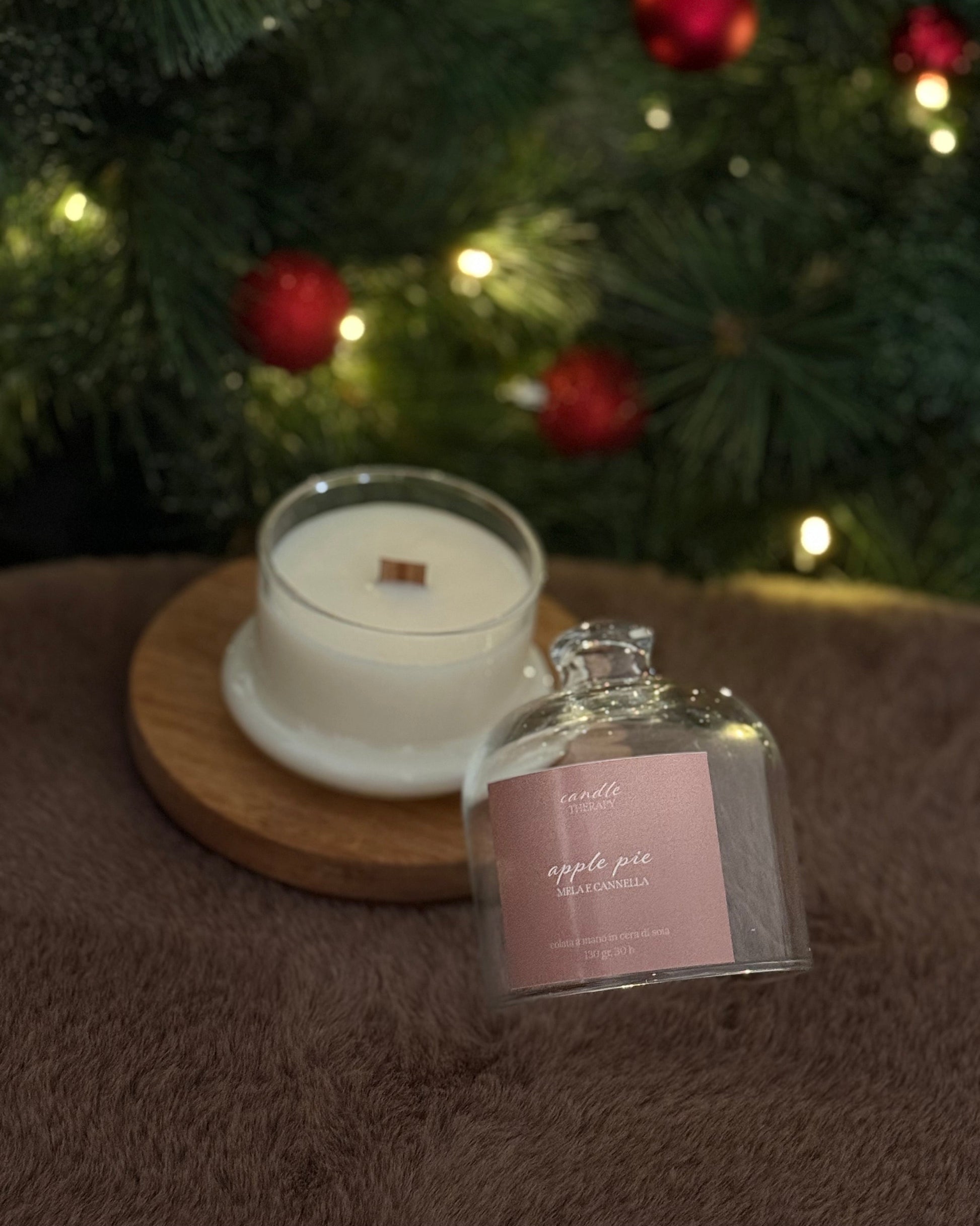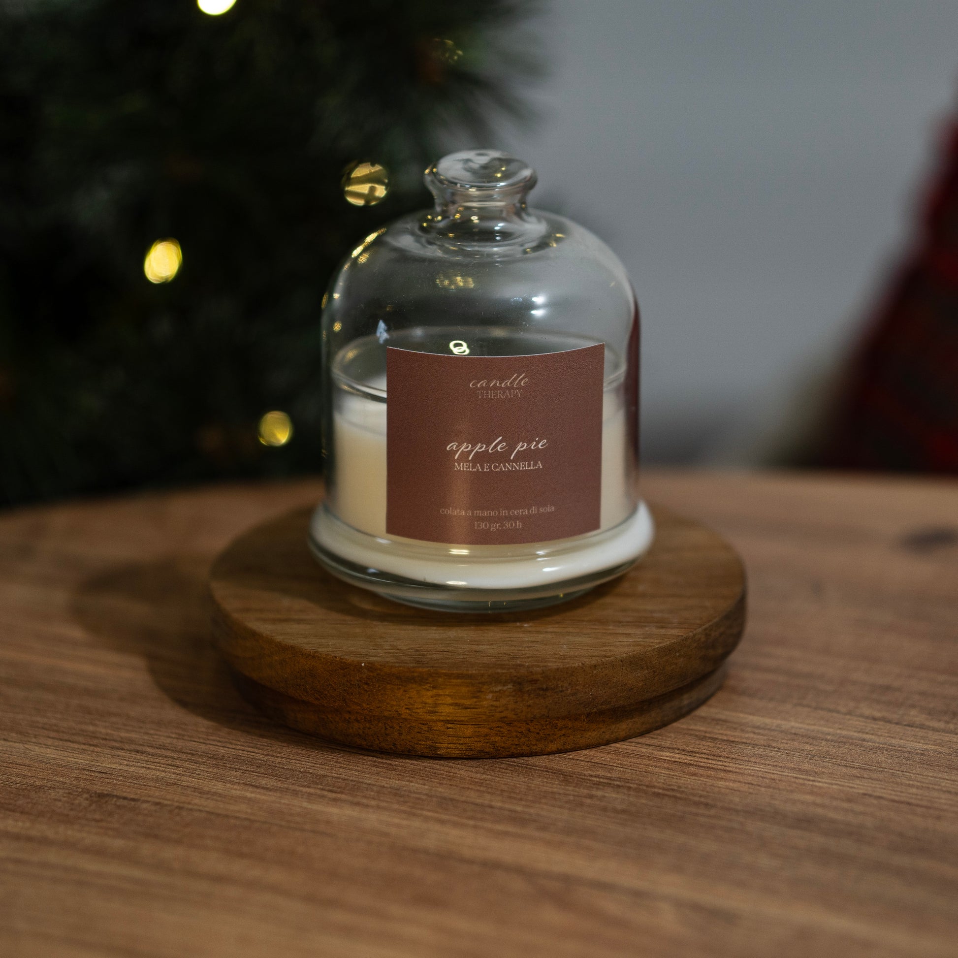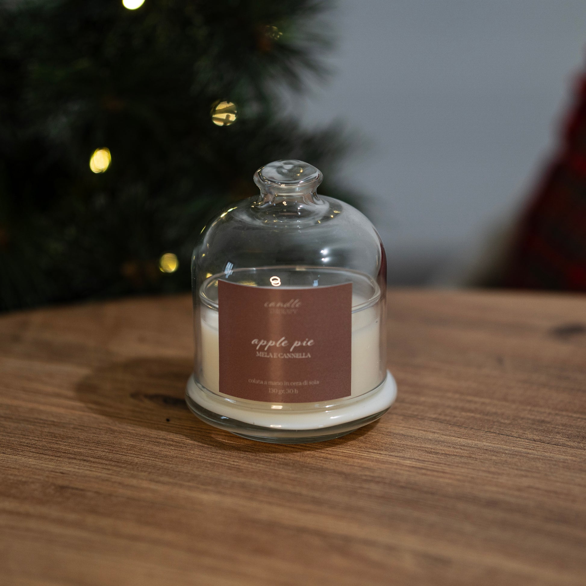 Candela artigianale colata a mano in pura cera di soia vegana ed ecosostenibile nel vasetto con cloche di vetro.
