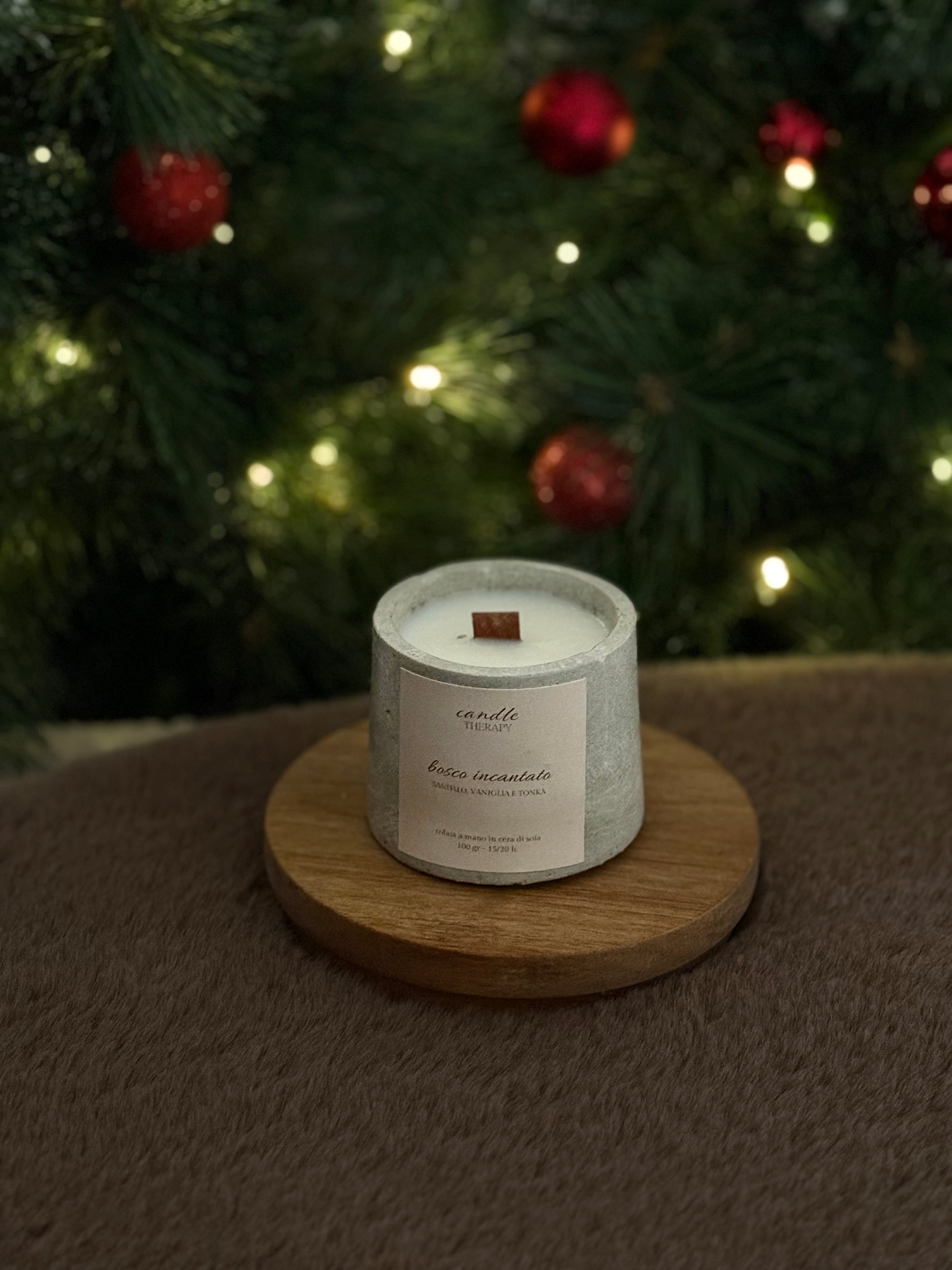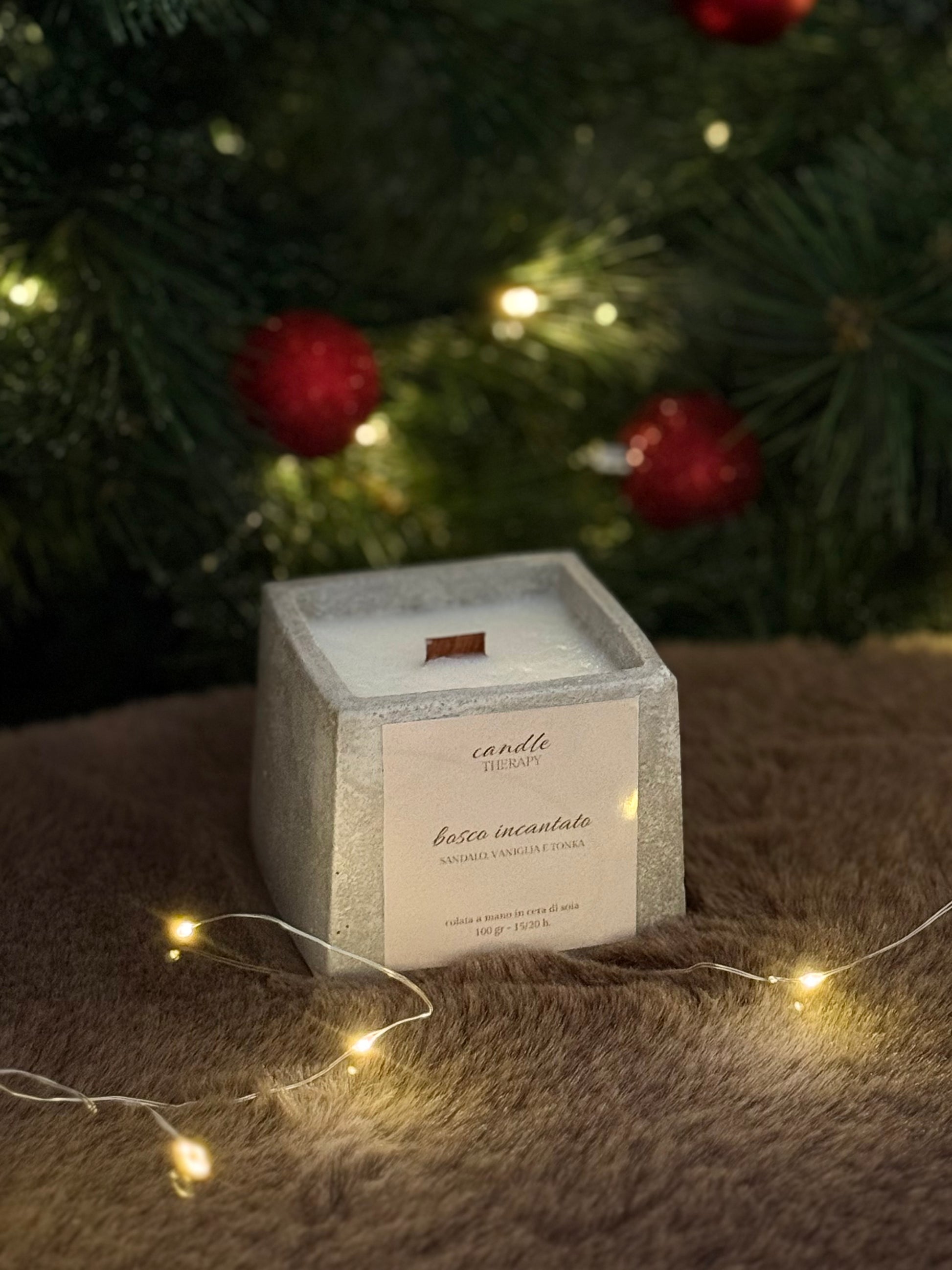 Candela artigianale colata a mano in pura cera di soia vegana ed ecologica. Il vasetto di cemento viene realizzato a mano direttamente da noi.