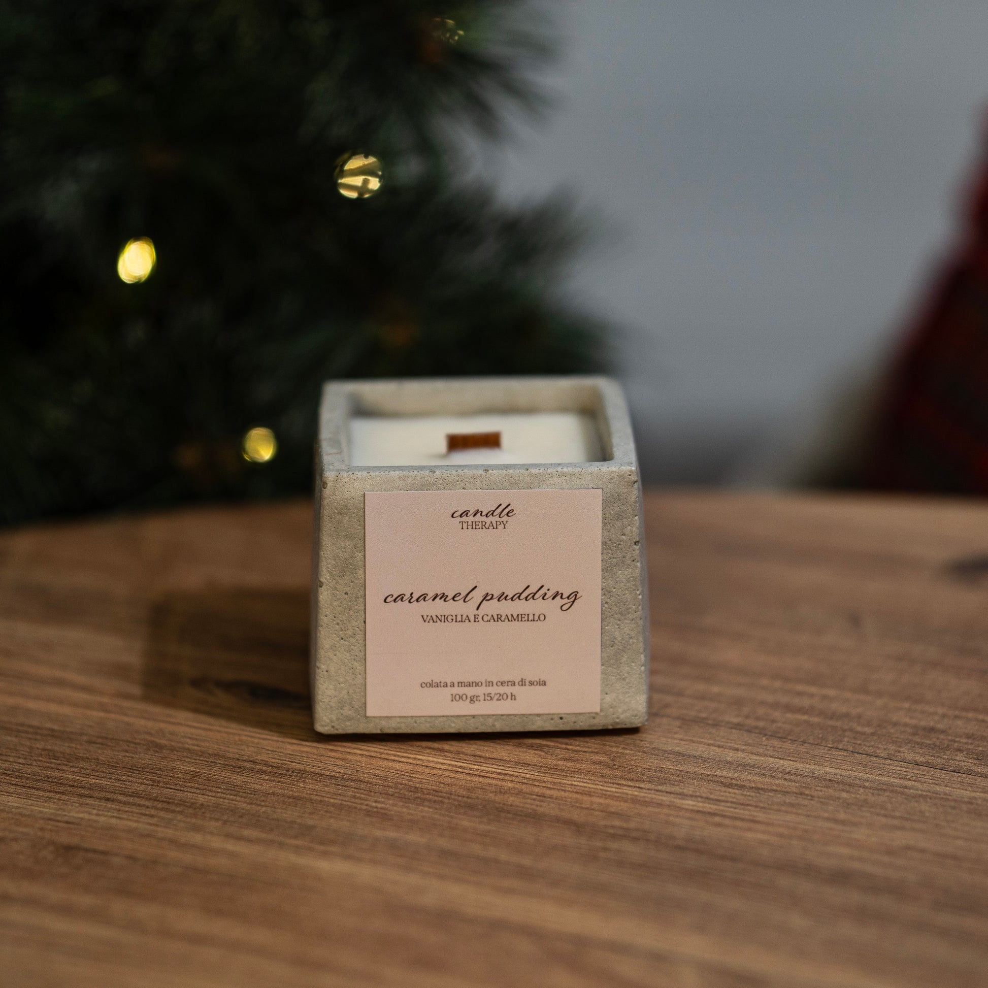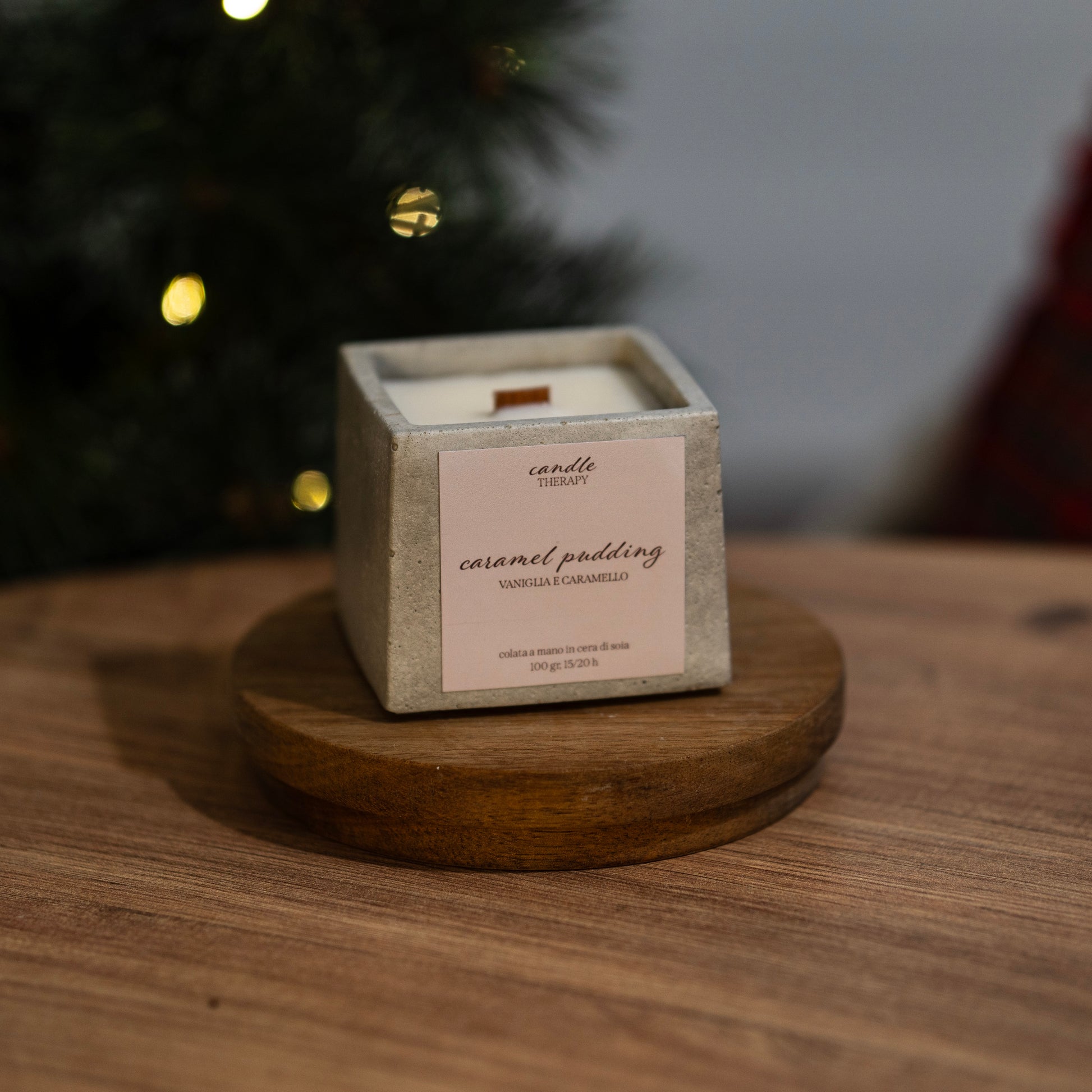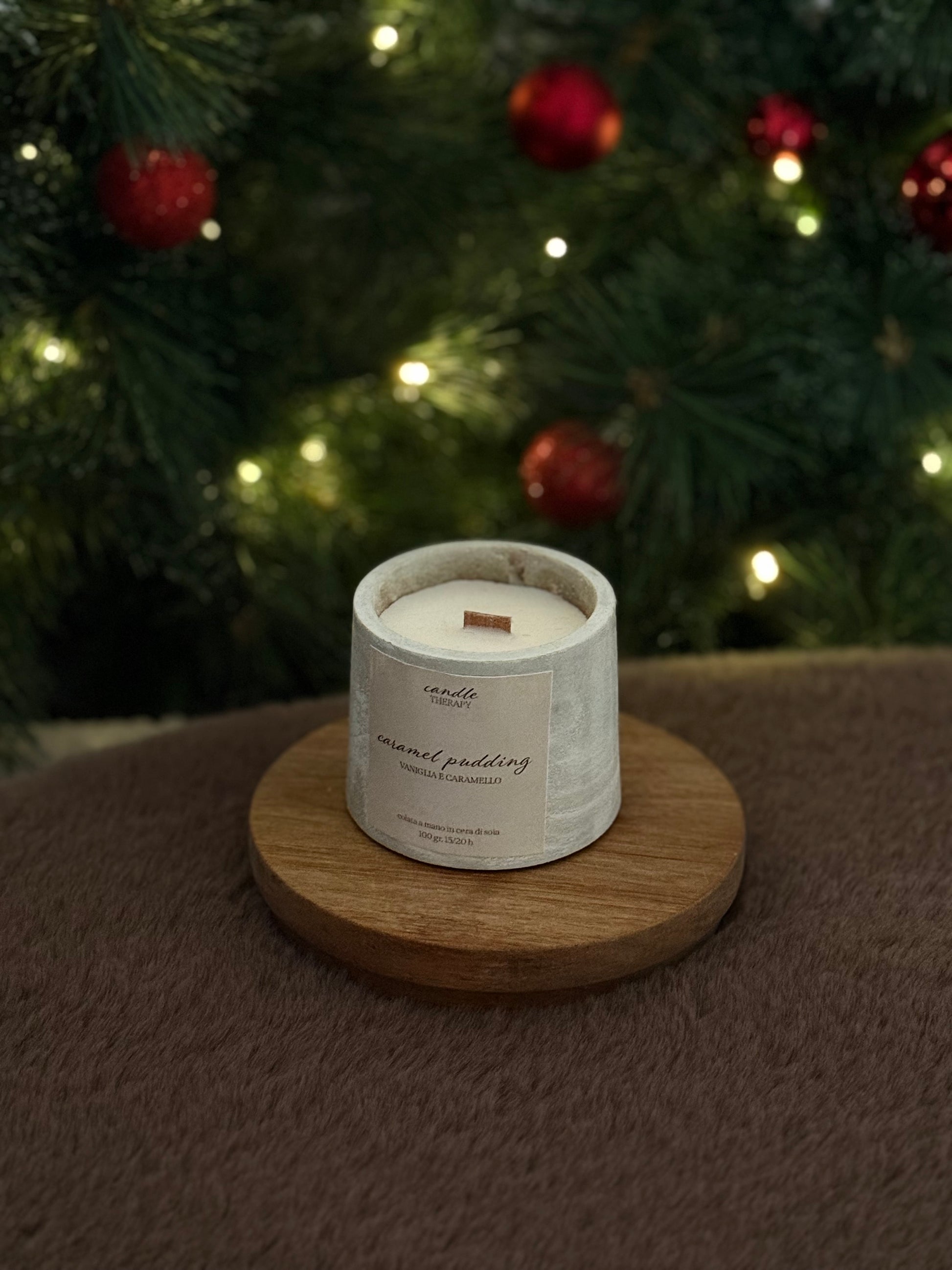 Candela artigianale colata a mano in pura cera di soia vegana ed ecosostenibile nel vasetto di cemento realizzato a mano direttamente da noi.