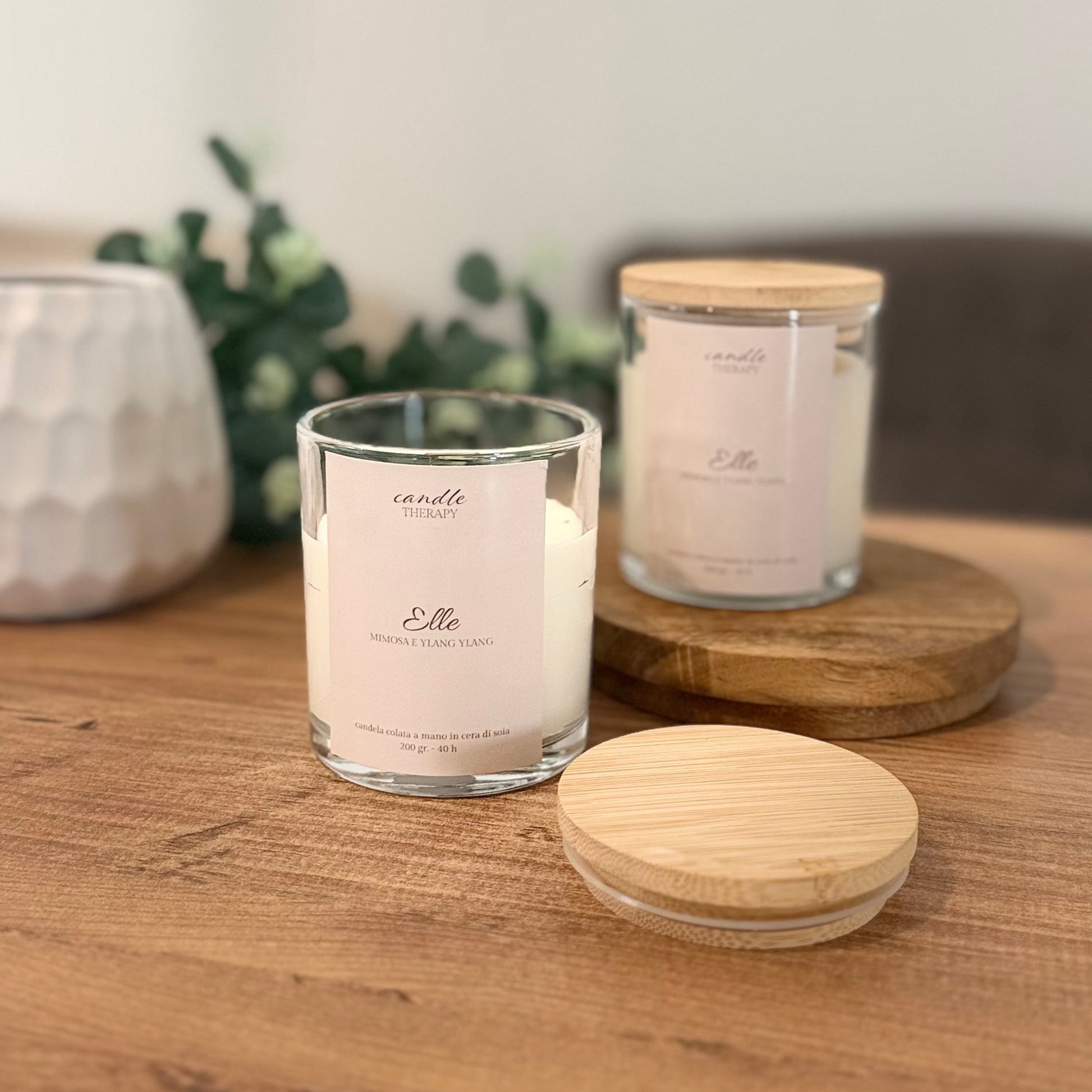 Prodotta in cera di soia ecologica e vegana colata a mano in vasetto di vetro trasparente con tappo in bambù incluso.