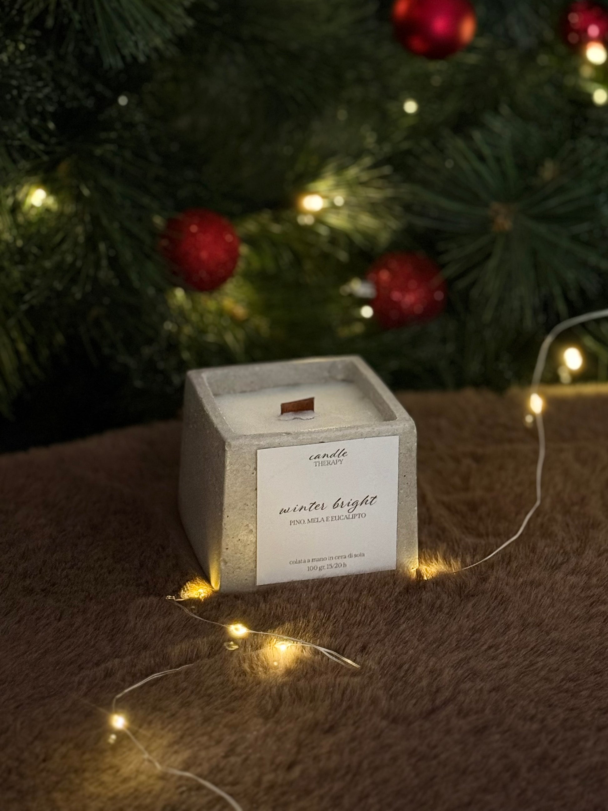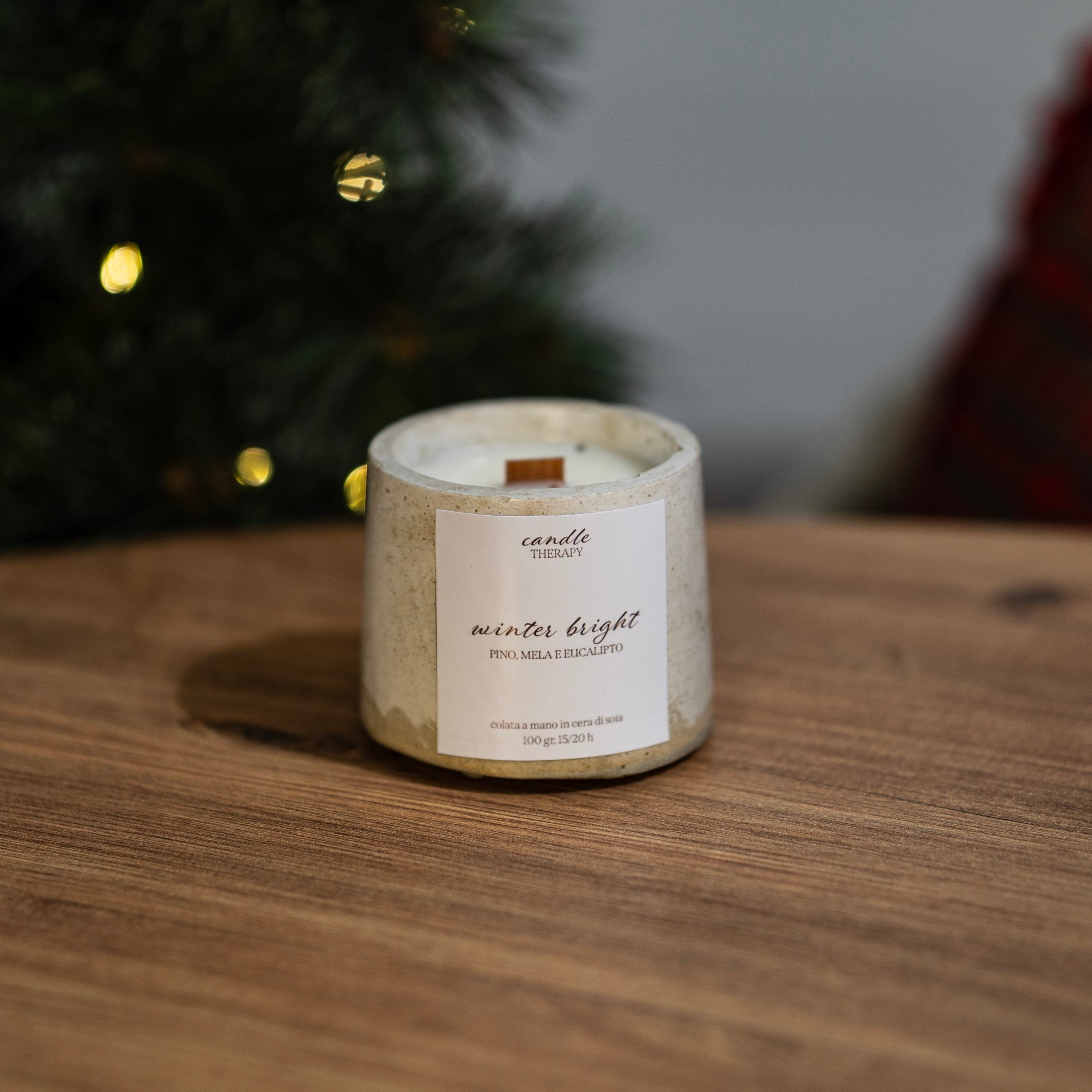 Candela artigianale colata a mano in pura cera di soia vegana ed ecosostenibile nel vasetto di cemento realizzato a mano direttamente da noi.